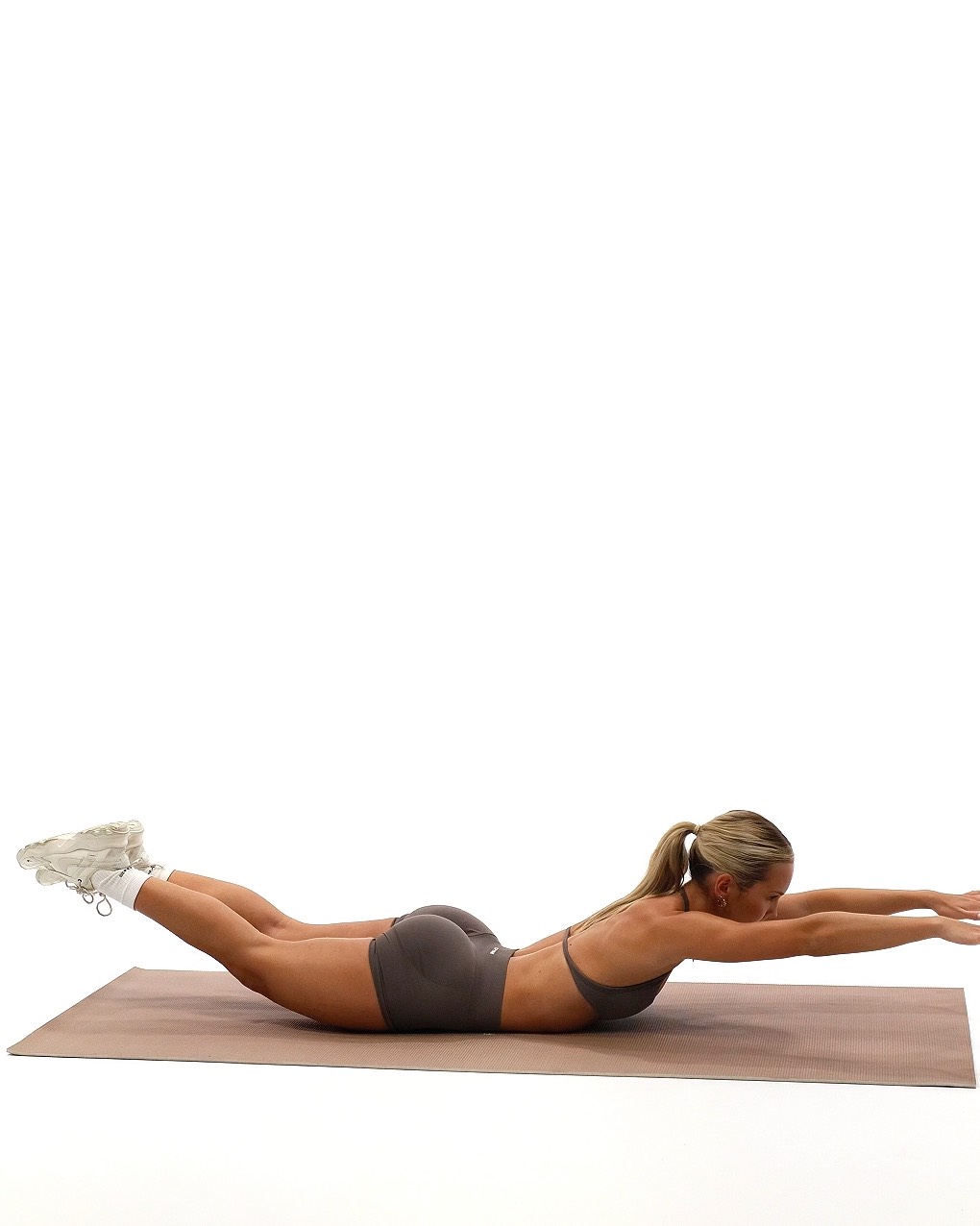 The Superman exercise strengthens the lower back, glutes, and shoulders by lifting the arms and legs off the ground while lying face down. It improves core stability, posture, and helps reduce lower back pain How to Perform - Lie on your stomach with your arms extended in front of you and your legs straight - Engage your core muscles - Slowly lift your arms and legs off the ground, keeping your knees and elbows straight - Hold for a few seconds - Slowly lower your arms and legs back to the ground