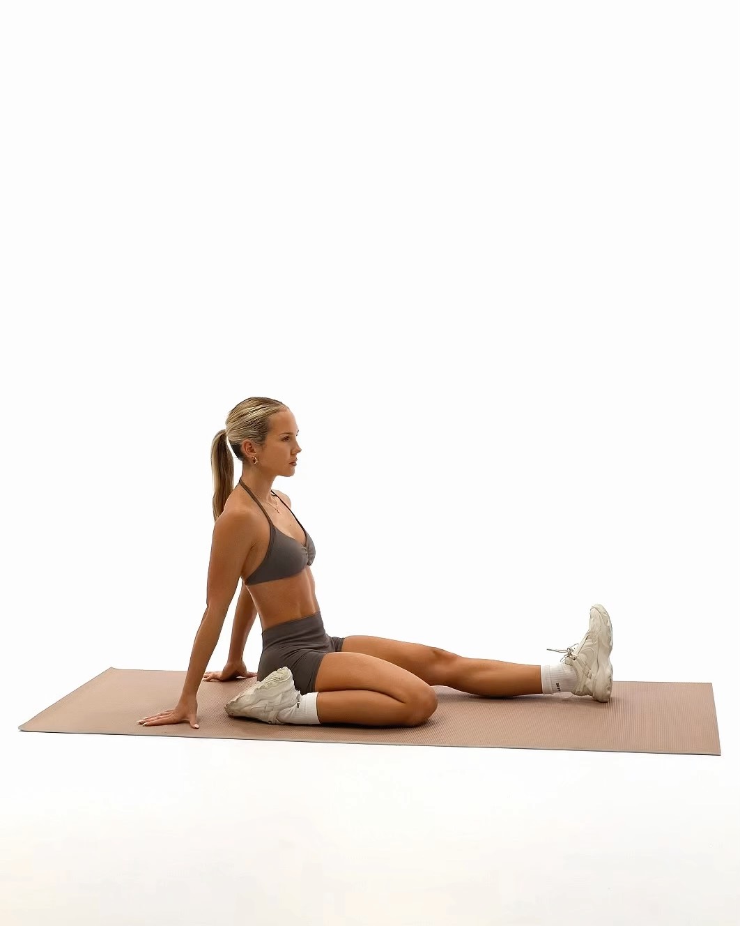 The Seated Glute Stretch involves sitting and crossing one leg over the other, then gently leaning forward to stretch the glute muscles. It helps relieve tension and improve hip flexibility How to Perform - Sit down placing one leg out flat in front of your body - Place your other leg across your body and twist your abdomen in reverse to your leg, resting your elbow on your knee and hold