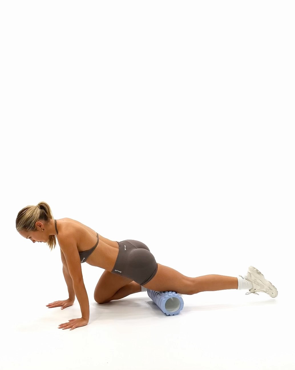 The Quad Roll uses a foam roller to massage the front of your thigh. Rolling along the quadriceps helps release muscle tightness, ease soreness, and improve flexibility How to Perform - Begin face down on the floor and place a foam roller under one thigh - Support your upper body with your hands on the floor pushing yourself up - Slowly roll your thigh over the foam roller from just above the knee up to the top of your thigh near the hip