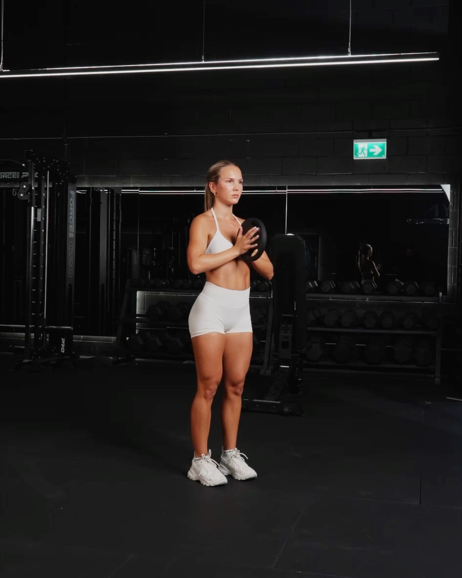 Setup - Have a weight plate pressed between your hands in front of your chest with your elbows bent at around a 90 degree angle - Stand with your feet shoulder width apart and engage your core Movement - Press the plate outward by extending your arms forward. Your elbows should travel outward to your torso - As you press, keep your wrists neutral, ensuring the plate doesn't tilt forward or backward. Maintain a firm grip on the plate - Press the plate as far forward as you can, extending your arms fully without locking the elbows out completely. Your arms should be extended in front of you at chest height or slightly higher - Slowly bring the plate back toward your chest. Keep your elbows bent at a 90 degree angle as you return to the starting position