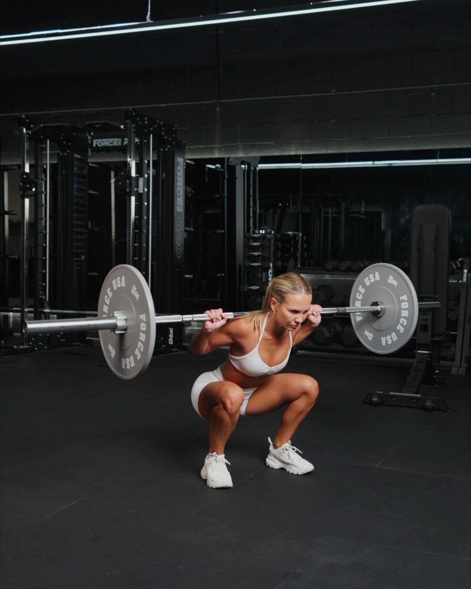 Setup - Position the barbell on a squat rack at about chest height - Position the barbell so it rests comfortably on your upper traps. Grip the bar with your hands wider than shoulder width apart and your elbows down Movement - Place your feet shoulder width apart with your toes externally pointed outwards slightly. Brace your core and hinge at the hips to simultaneously bend your knees. Push your hips back first, then drop your knees to allow your thighs to descend - Keep your chest up and eyes forward. Maintaining a neutral spine throughout the movement - Lower yourself until your thighs are parallel to the ground or your hips drop below your knees - Drive through your heels to push yourself back to a standing position