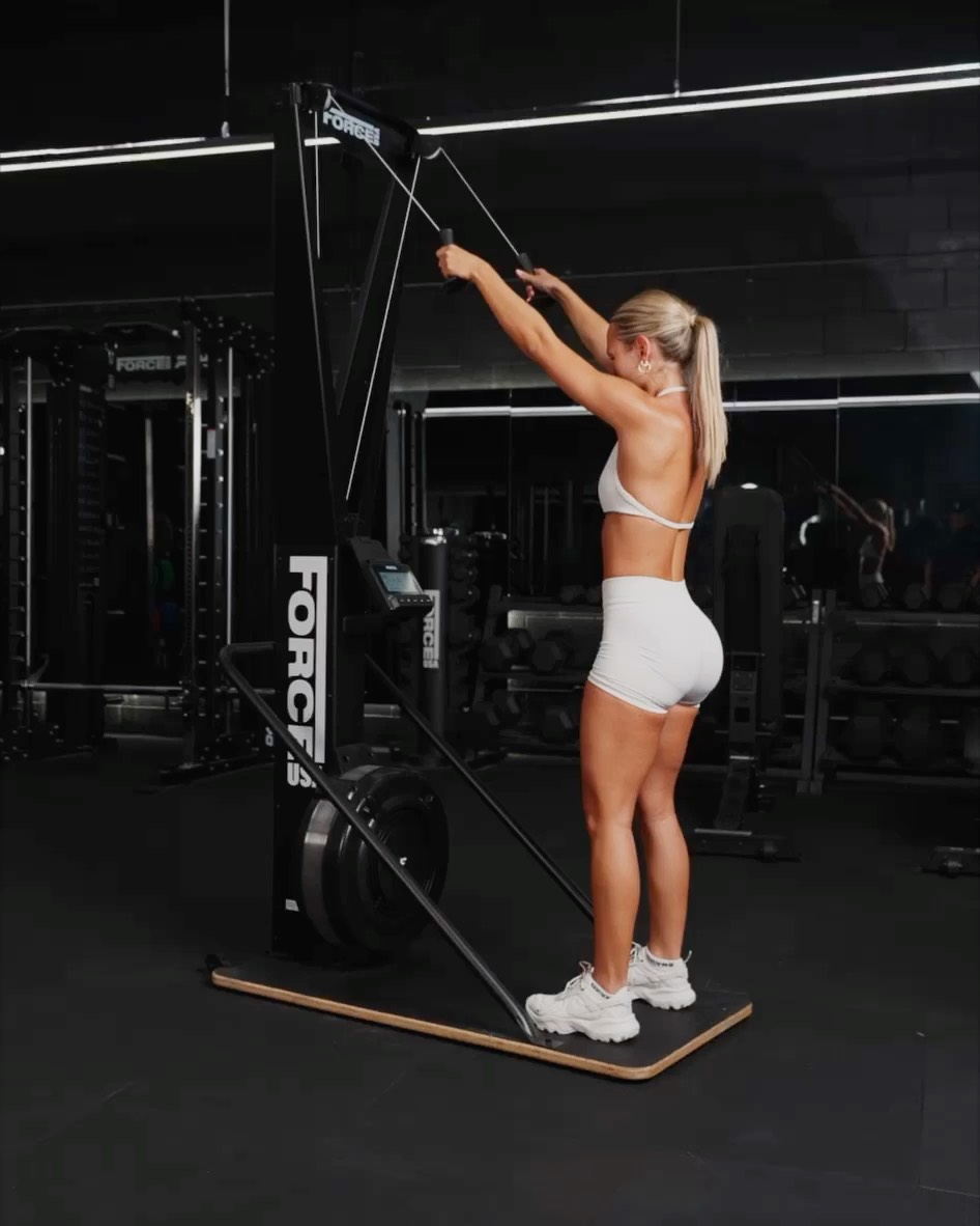 Setup - Stand facing the Ski Erg with your feet shoulder width apart - Grasp the handles with both hands, keeping your arms extended in front of you at about shoulder height Movement - Begin by pulling the handles down, driving your arms down and outwards. As you pull engage your back, shoulders and arms - At the bottom of the pull, your arms should be fully extended down with your body slightly leaning forward - Allow the handles to return to the starting position