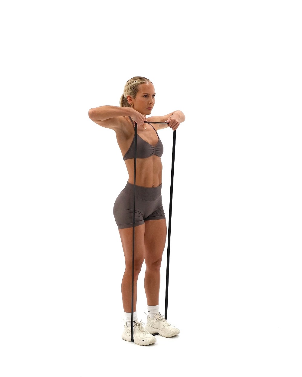 The Banded Upright Row is a strength exercise targeting your shoulders, upper back, and traps. Instead of using a barbell or dumbbells, you perform the movement using a resistance band, making it joint-friendly and easy to do anywhere How to Perform - Stand with your feet hip-width apart, securing the resistance band under both feet. Hold the other end of the band with both hands in front of your thighs, palms facing your body - Pull the band upward toward your chest, leading with your elbows and keeping them higher than your hands - Pause at the top when your hands reach chest level, then slowly lower the band back down