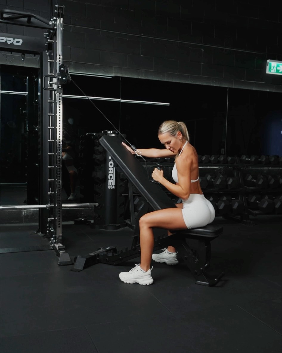 Setup - Set the incline bench at an angle of about 40-60 degrees - Adjust the pulley of the cable to height comfortable to pull the handle down in a controlled manner. Attach the stirrup handle - Sit on the bench with your body facing towards the back of the bench with your right hand placed on the top of the bench for support and the left hand gripping the handle Movement - Start at full extension and begin to pull your left arm down, leading with your elbow until you reach the side of your torso or slightly further. Your elbow should be pointing directly towards the floor - As you come down keep your elbow tucked into your body, and squeeze your lat at the bottom before releasing and reversing the movement going back to the starting position