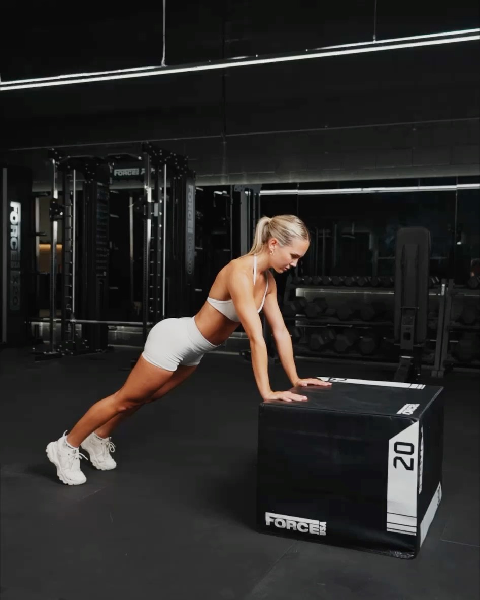 Setup - Find a stable box or elevated surface - Place your hands on the box with your palms facing down. Position your hands slightly wider than shoulder width. Be sure that your foot position is far enough to form a straight line with your body Movement - Bend your elbows and lower your chest towards the box. Keep your elbows at about a 45 degree angle from your body (not too flared out) - Lower your body until your chest or chin touches the top of the box, or as close as possible. Ensure your body remains in a straight line - Push through your palms, extending your arms to return to the starting position - As you push up, focus on engaging your chest and triceps to press your body away from the box