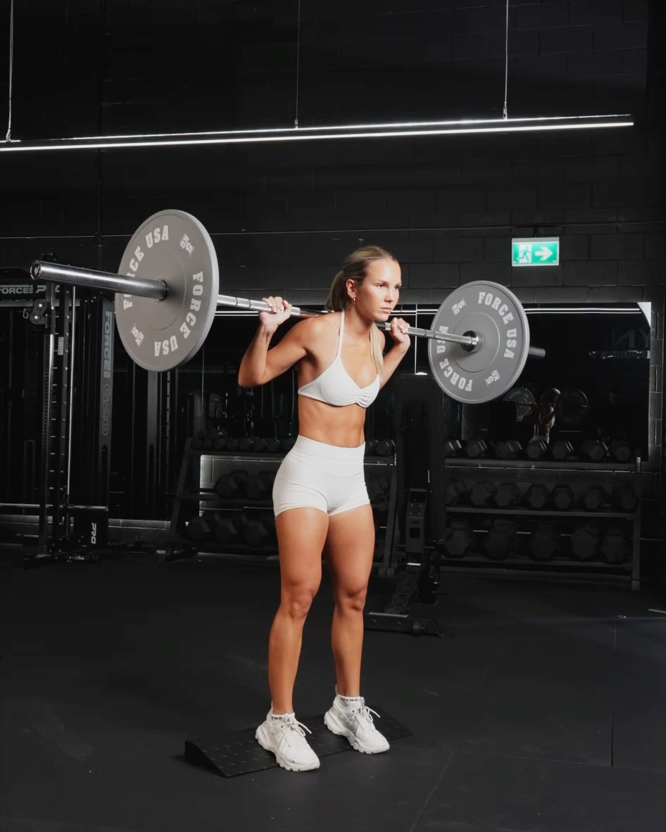 Setup - Place a weight plate or specialised weight under your heels - Place the barbell across your upper traps. Stand with your feet shoulder width apart with your toes externally pointed outwards slightly. Place your heels securely on the elevated surface Movement - Begin the squat by bending your hips and knees at the same time. Sit your hips back and down towards the floor while keeping your chest up and your spine neutral - As you lower yourself, allow your knees to travel forward over your toes while keeping the weight on your heels or mid foot - Lower yourself until your thighs are parallel to the floor or slightly deeper - Press through your heels and the balls of your feet to extend your knees and hips back up to the starting position
