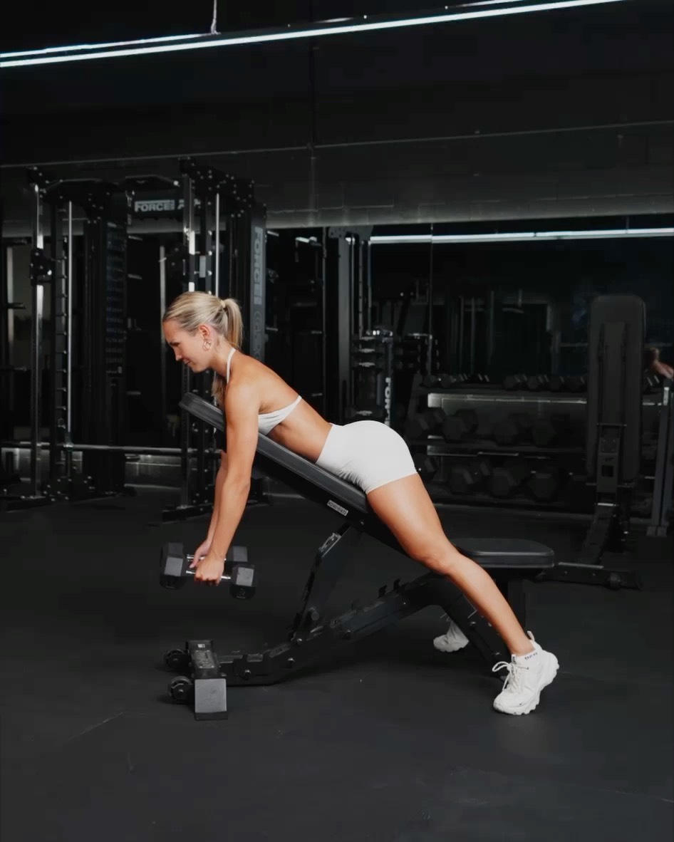 Setup - Set an incline bench to a 30-45 degree angle - Place a dumbbell on either side of the bench so you can easily grab them when you begin - Position yourself on the bench with your chest supported against the inclined surface, ensuring that your, head, neck and spine are in a neutral position - Place your feet flat on the ground or use the tops of your feet for support - Grab the dumbbells with both hands Movement - Row the dumbbells upward towards your torso, driving your elbows straight back. Focus on keeping your elbows close to your body and squeezing your shoulder blades together at the top of the movement - Pause briefly at the top, maximising the contraction in your back muscles - Slowly lower the dumbbells back down to the starting position
