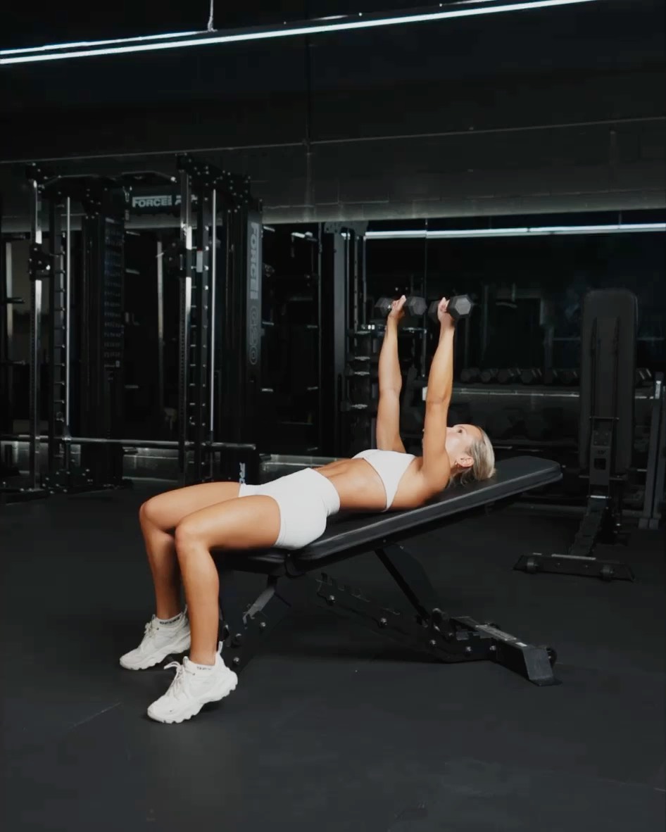 Setup - Sit on a flat bench with a dumbbell in each hand resting on your thighs - Lie back on the bench and fully extend your arms to have the dumbbells above your chest - Your feet should be flat and pressed into the floor Movement - Lower the dumbbells towards your chest, keeping your elbows at about a 45 degree angle to your body - Lower until the dumbbells are at chest level - Press the dumbbell back toward the starting position, driving through your chest and squeezing the muscles at the top