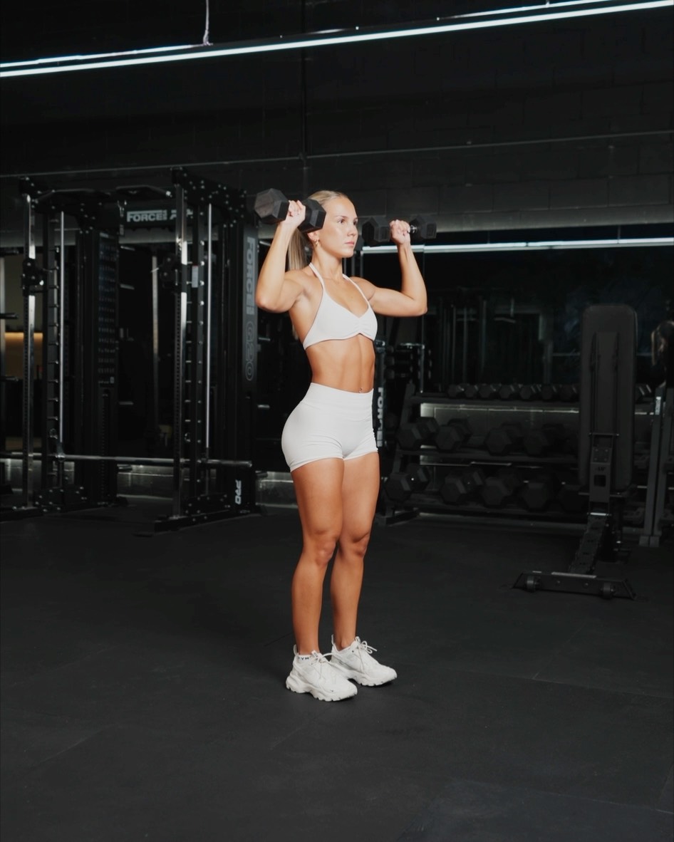 Setup - Stand with your feet shoulder width apart, holding a dumbbell in each hand at shoulder height and at a 90 degree angle. Palms facing outwards Movement - Press the dumbbells overhead by extending your arms, keeping your elbows slightly bent - At the top your arms shoulder be fully extended, slowly lower the dumbbells back to the starting position stopping just above your shoulders