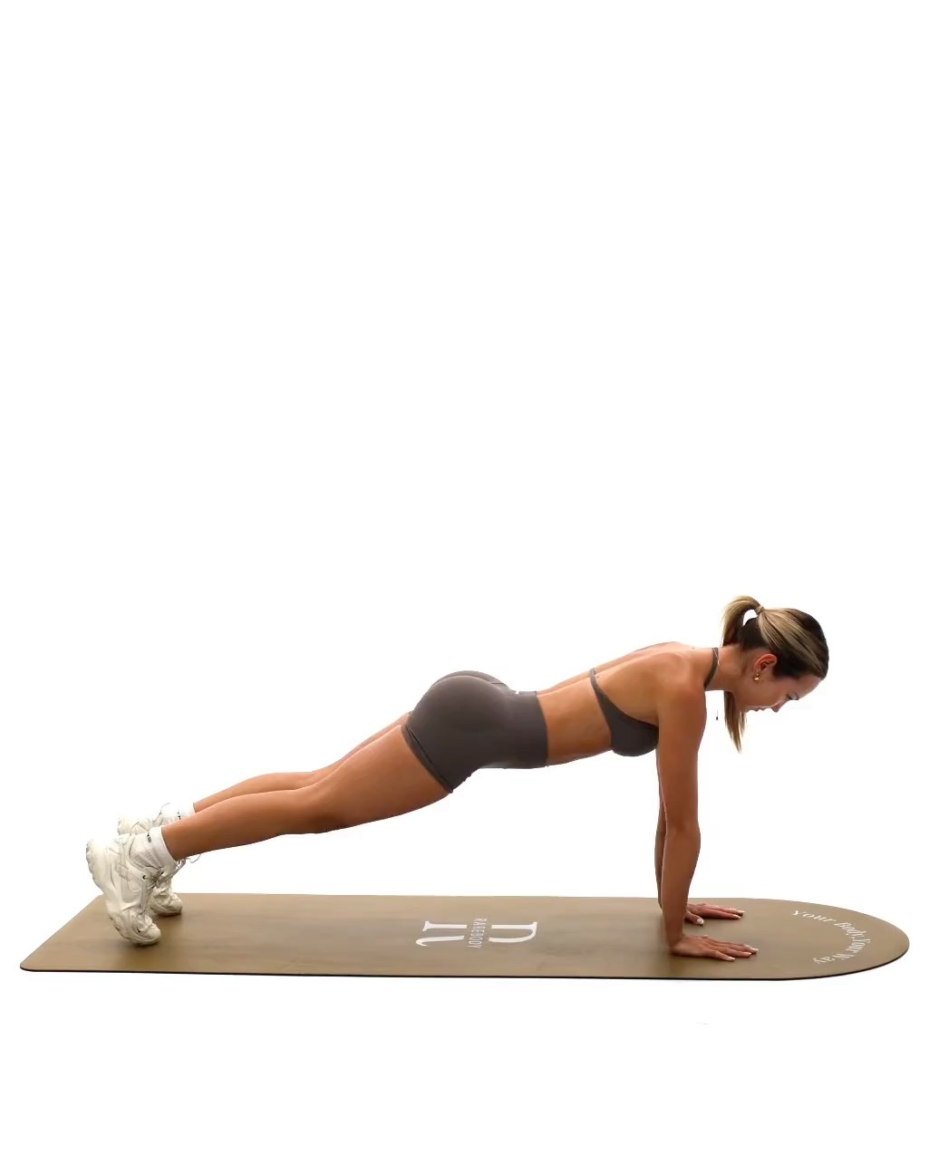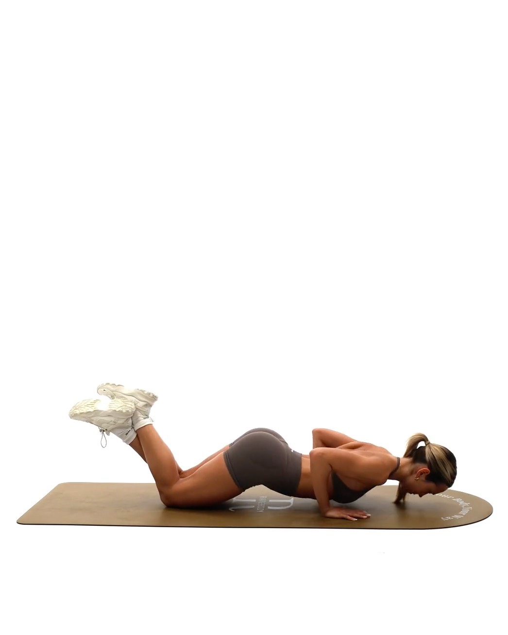 Setup - Start with a plank position with your hands placed slightly wider than shoulder width apart on the floor - Rest your knees on the floor together or slightly apart Movement - Bend your elbows and lower your chest towards the floor, keeping your body in a straight line - Keep your elbows at about a 45 degree angle from your body and ensure your hands are placed directly under your shoulders or slightly wider - Lower your chest until it is just a few inches above the ground - Press through your palms and push your body back up to the starting position