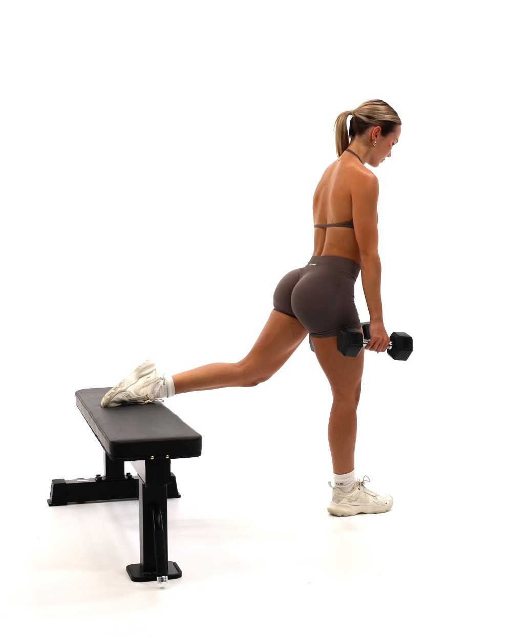 Setup - Find a bench and place one foot on it behind you. Your back foot should be resting on the bench with toes pointing down - Position your front foot 2-3 feet in front of the bench. Your front knee should be in line with your toes, and your front foot should be flat on the ground Movement - Engage your core, bend your front knee and lower your hips straight down towards the ground - Lower your body until your thigh is parallel to the ground or slightly below, and your back knee is close to the floor - Push back through the heel of your front foot and straighten your leg to return to the starting position