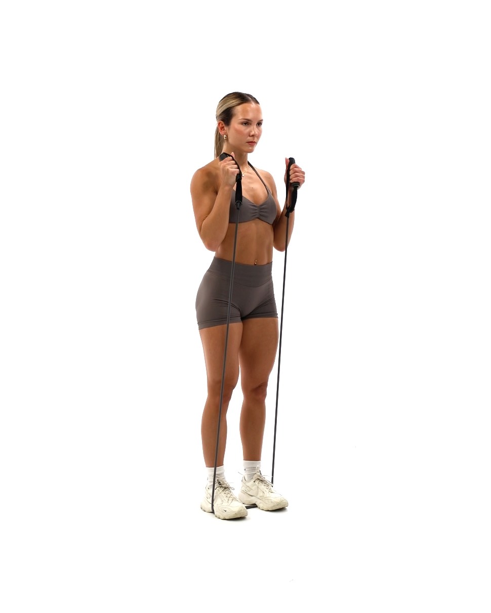 Setup - Stand on the middle of a resistance band with feet about shoulder-width apart - Hold the band’s handles (or ends) with a neutral grip (palms facing each other, thumbs pointing up) Movement - Keep elbows tucked close to your sides. - Curl your hands up toward your shoulders, maintaining the neutral grip throughout. Squeeze your biceps hard at the top - Slowly extend your arms back down to the starting position, resisting the band’s pull