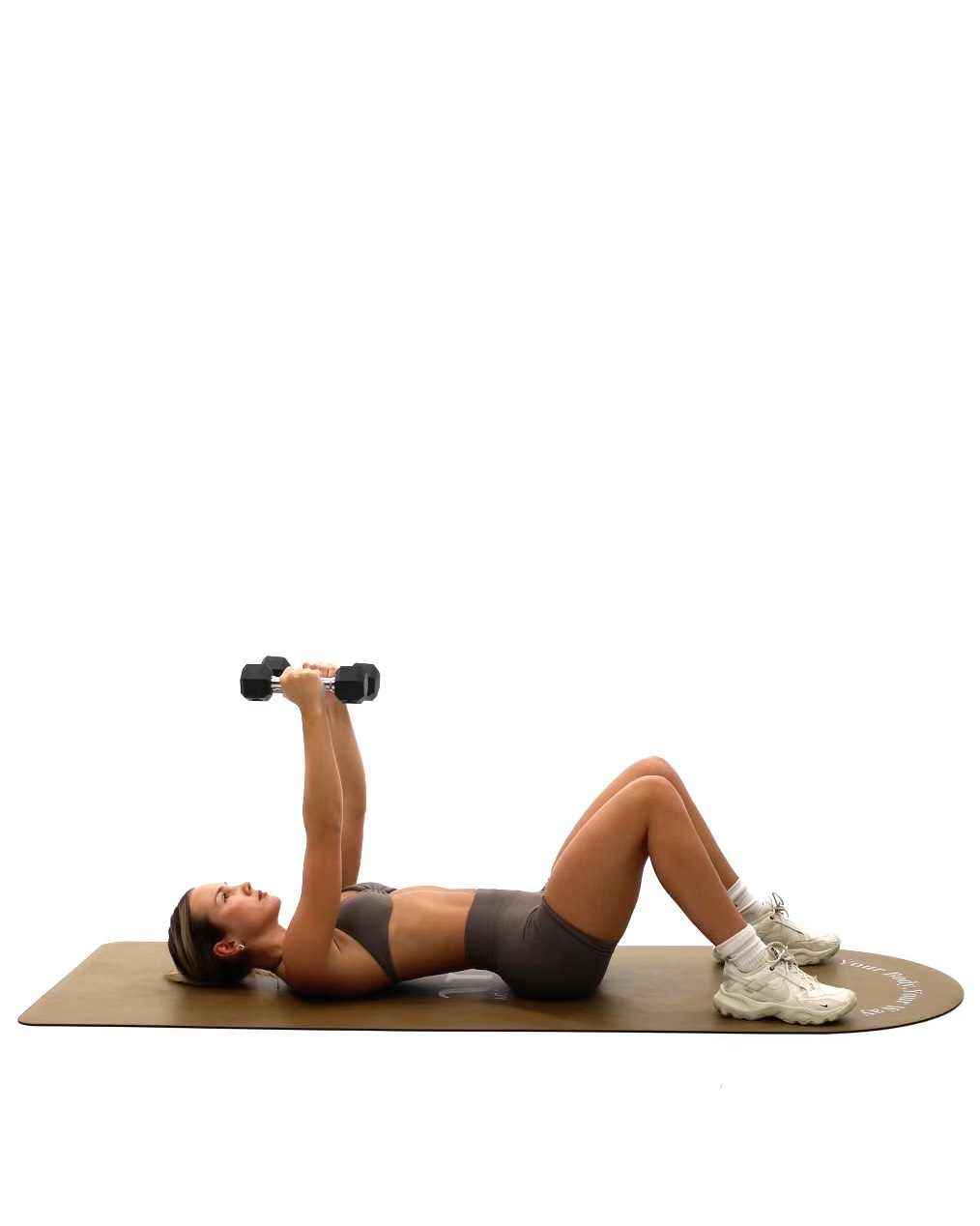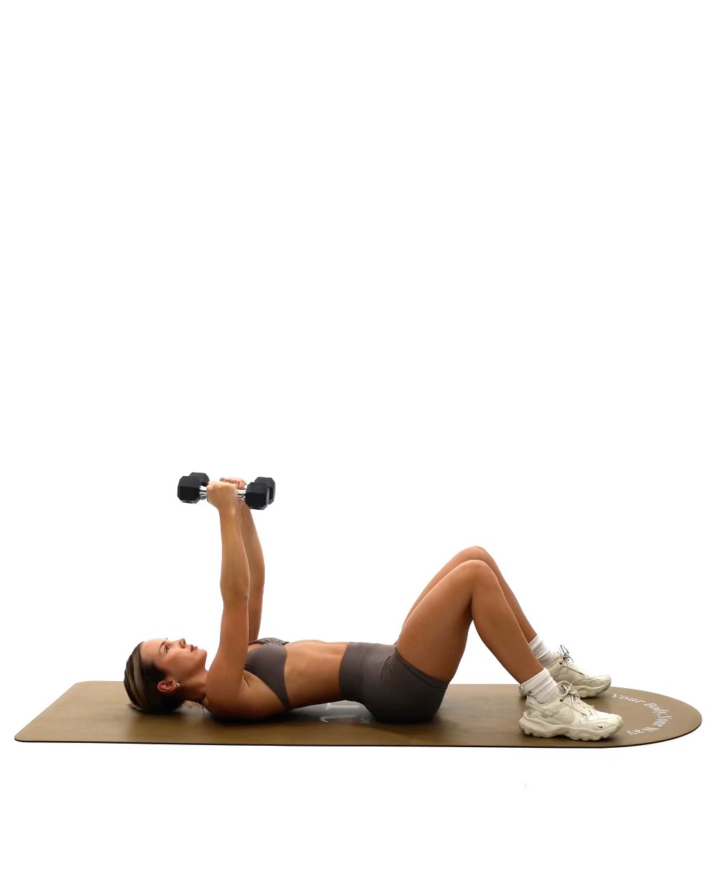 Setup -Lie flat on your back on the ground with a dumbbell in each hand -Bend your knees and keep your feet flat on the floor for stability -Hold the dumbbells directly above your chest with your palms facing each other (neutral grip) -Keep the dumbbells close together, lightly touching if comfortable -Tuck your elbows in close to your sides and engage your core Movement -Press the dumbbells upwards, keeping them close together as you extend your arms -Fully extend your elbows without locking them out at the top -Lower the dumbbells slowly back down until your triceps lightly touch the floor -Keep your elbows close to your ribcage throughout the movement -Pause briefly at the bottom, then press the dumbbells back up to the starting position -Repeat for the desired number of reps