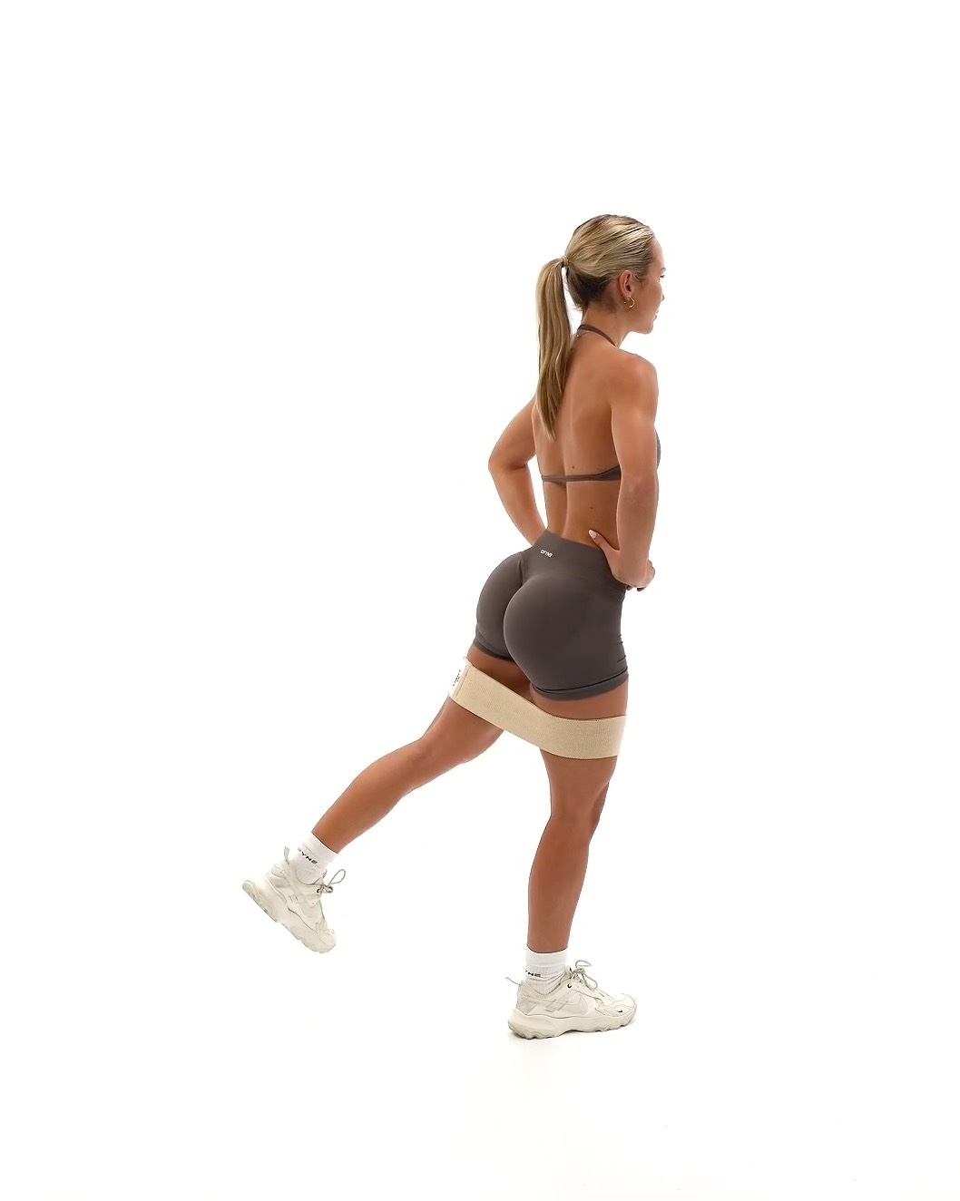 Banded Standing Kickbacks strengthen the glutes by extending the hip against resistance from a band. This exercise improves muscle activation, hip stability, and balance without the need for weights How to Perform - Place a resistance band around thighs just above your knees - Stand tall with feet hip-width apart and engage your core - Shift your weight onto one leg and slowly kick the other leg straight back, keeping it straight and pushing against the band’s resistance - Squeeze your glute at the top of the movement - Return the leg to the starting position with control