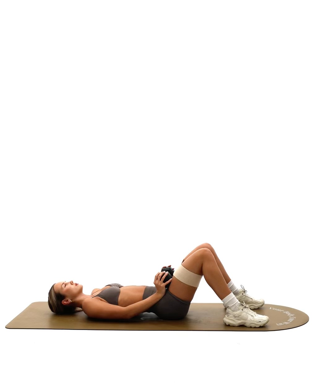 Setup - Take a resistance band and place it around your thighs, just above your knees - Grab a dumbbell and place it across your hips. Hold the dumbbell with both hands to keep it stable and prevent it from shifting during the exercise - Lie flat on your back with your knees bent and feet flat on the floor, hip width apart. Ensure your feet are positioned beneath your knees Movement - Press through your heels and squeeze your glutes to lift your hips off the floor - At the top of the thrust, your body should form a straight line from your shoulders to your knees - The dumbbell should stay stable across your hips, and your knees should be actively pressing outwards against the band - Slowly lower your hips back down to the ground, resisting the band’s pull as your knees naturally want to move inwards