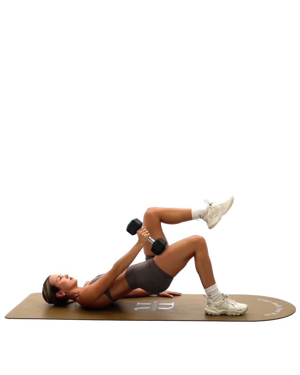 Setup - Lie on the floor with your back flat, knees bent at a 90° and feet planted at hip-width apart - Place a dumbbell on top of your working leg using one hand and place your other hand on the ground beside you Movement - On your working leg position your foot so that it is flat beneath your knee. Approximately hip-width apart. The other leg should be raised and kept bent in the air - Engage your core and glutes as you press through the heel of the foot on the ground to lift your hips upward. Squeeze your glutes at the top of the movement - Slowly lower your hips back down towards the ground, stopping before your glutes touch the floor