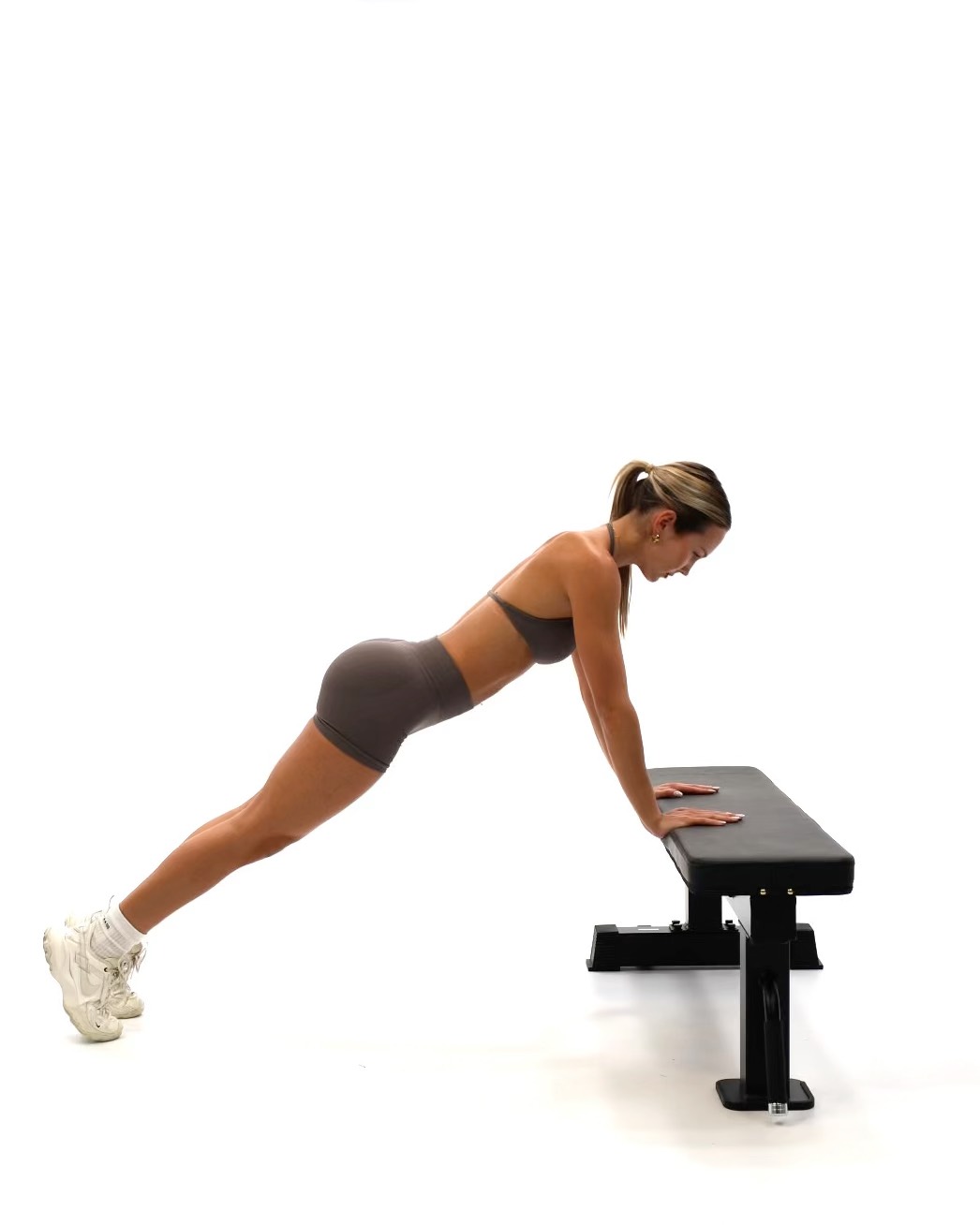Setup - Find a bench or elevated surface - Place your hands on bench with your palms facing down. Position your hands slightly wider than shoulder width. Be sure that your foot position is far enough to form a straight line with your body Movement - Bend your elbows and lower your chest towards the bench. Keep your elbows at about a 45 degree angle from your body (not too flared out) - Lower your body until your chest or chin touches the top of the bench, or as close as possible. Ensure your body remains in a straight line - Push through your palms, extending your arms to return to the starting position - As you push up, focus on engaging your chest and triceps to press your body away from the bench