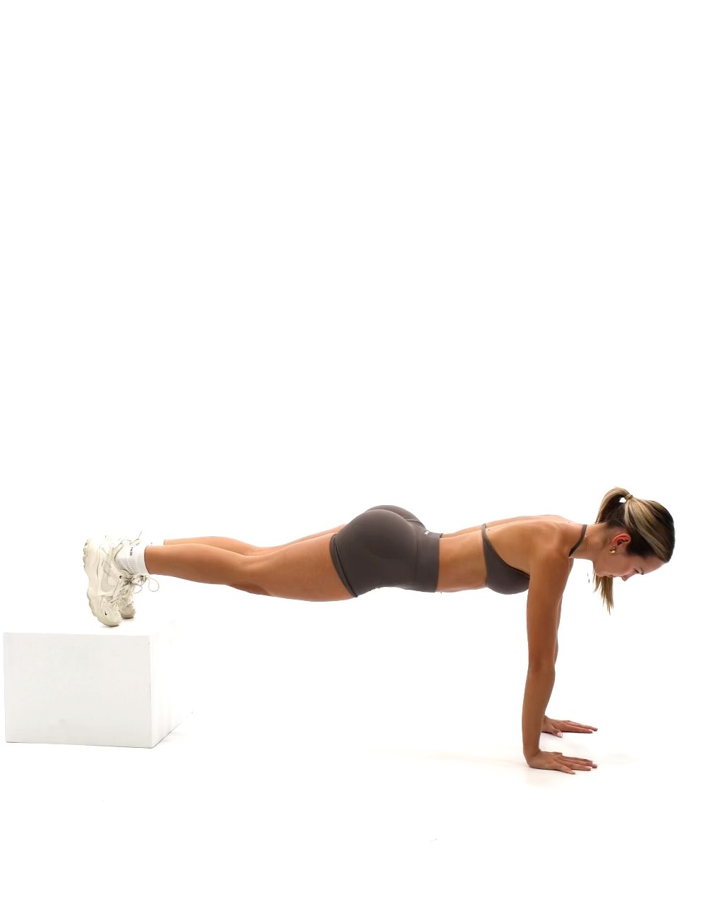 Setup - Place your feet on an elevated surface (bench, box, or step) -Hands should be slightly wider than shoulder-width apart, on the floor - Keep your body in a straight line from head to heels, engaging your core and glutes Movement - Bend your elbows to lower your chest toward the floor - Keep your elbows at about a 45° angle from your torso - Push through your hands to return to the starting position - Fully extend your arms without locking elbows