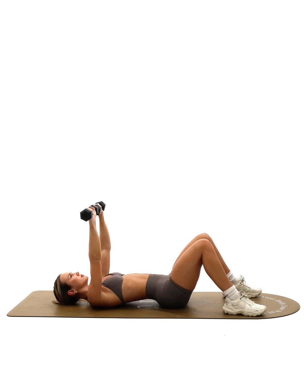 Setup - Lie flat on the ground and fully extend your arms to have the dumbbells above your chest - Your Legs should be bent and at a comfortable angle Movement - Lower the dumbbells towards your chest, keeping your elbows at about a 45 degree angle to your body - Lower until your elbows slightly touch the ground - Press the dumbbell back towards the starting position, driving through your chest and squeezing the muscles at the top