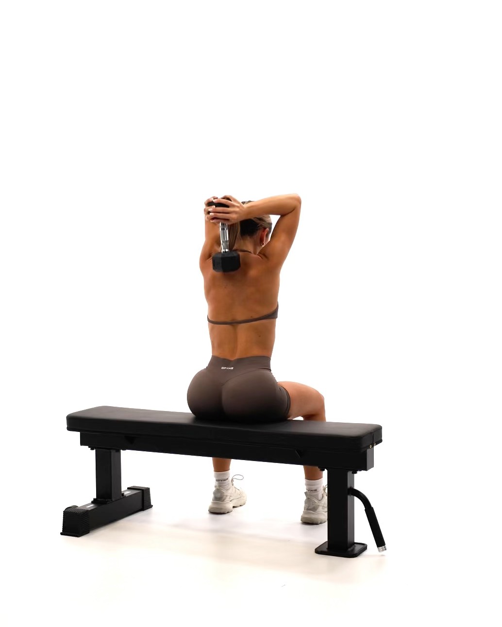 Set Up - Sit on a bench or hard surface with a dumbbell over your head held near your upper back. Elbows should be close to your ears Movement - Slowly extend your elbows and lift the dumbbell above your head - Slowly bring dumbbell back down until you feel the stretch in your triceps - Repeat movement