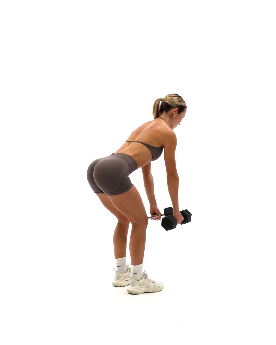 Setup - Stand with your feet hip width apart and a hold a dumbbell in each hand with a neutral grip (palms facing your body) Movement - Slightly bend your knees and hinge forward at your hips, keeping your back straight. Your torso should be at about a 45 degree angle to the ground - Pull the dumbbells towards your lower ribs or upper abdomen. Lead the movement with your elbows rather than your hands. Keep your elbows close to your body through the entire motion - At the top of the row, squeeze your shoulder blades together, fully contracting the muscles of the upper back (Rhomboids, Traps, Lats) - Slowly lower the dumbbells back towards the ground, fully extending your arms to the starting position
