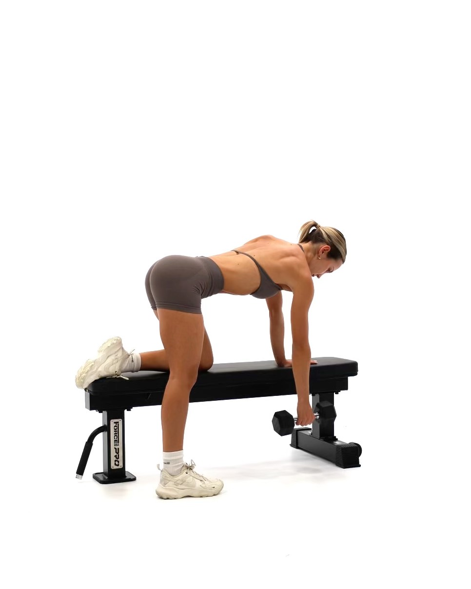 Setup - Place one leg onto bench and the other out to the side - Hinge forward at your hips, leaning over the bench with hand placed on bench for support. Your back should be kept straight Movement - Grip the dumbbell in one hand, letting it hang directly beneath your shoulder - Pull the dumbbell upwards and towards your hip, keeping your elbow close to your body - At the top of movement, pause for a brief second and return slowly to the starting position fully extending your arm to maximum stretch