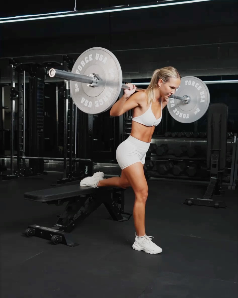 Setup - Place a barbell on a squat rack and place a bench behind you - Rest the barbell across your upper traps and grip the barbell wider than shoulder width apart - Step your front leg forward so that your foot is flat on the floor, with your knee aligned with your toes. Your back leg should be elevated on the bench behind you, with your toes pointing down and your knee slightly bent - Brace your core, ensuring that your chest stays lifted and your back remains neutral throughout the movement and engage your core Movement - Lower your body by bending your front knee, keeping it aligned with your toes and lean your body forward slightly. Your back leg should bend until your back knee is just above the ground - In the lowest position, your front thigh should be parallel to the floor or slightly below - Push through your front heel of your front foot to extend the knee and hip, driving your body back up to the starting position
