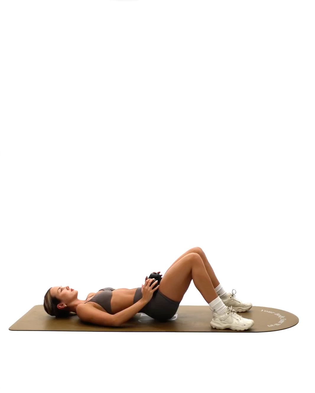 Setup - Lie on your back with knees bent and feet flat on the floor, hip-width apart - Hold a dumbbell on your hips with both hands (palms pressing into the dumbbell for stability) - Engage your core Movement - Drive through your heels to lift your hips toward the ceiling - Your body should form a straight line from shoulders to knees at the top - Squeeze your glutes hard at the top - Slowly lower your hips back to the floor without letting your glutes completely relax