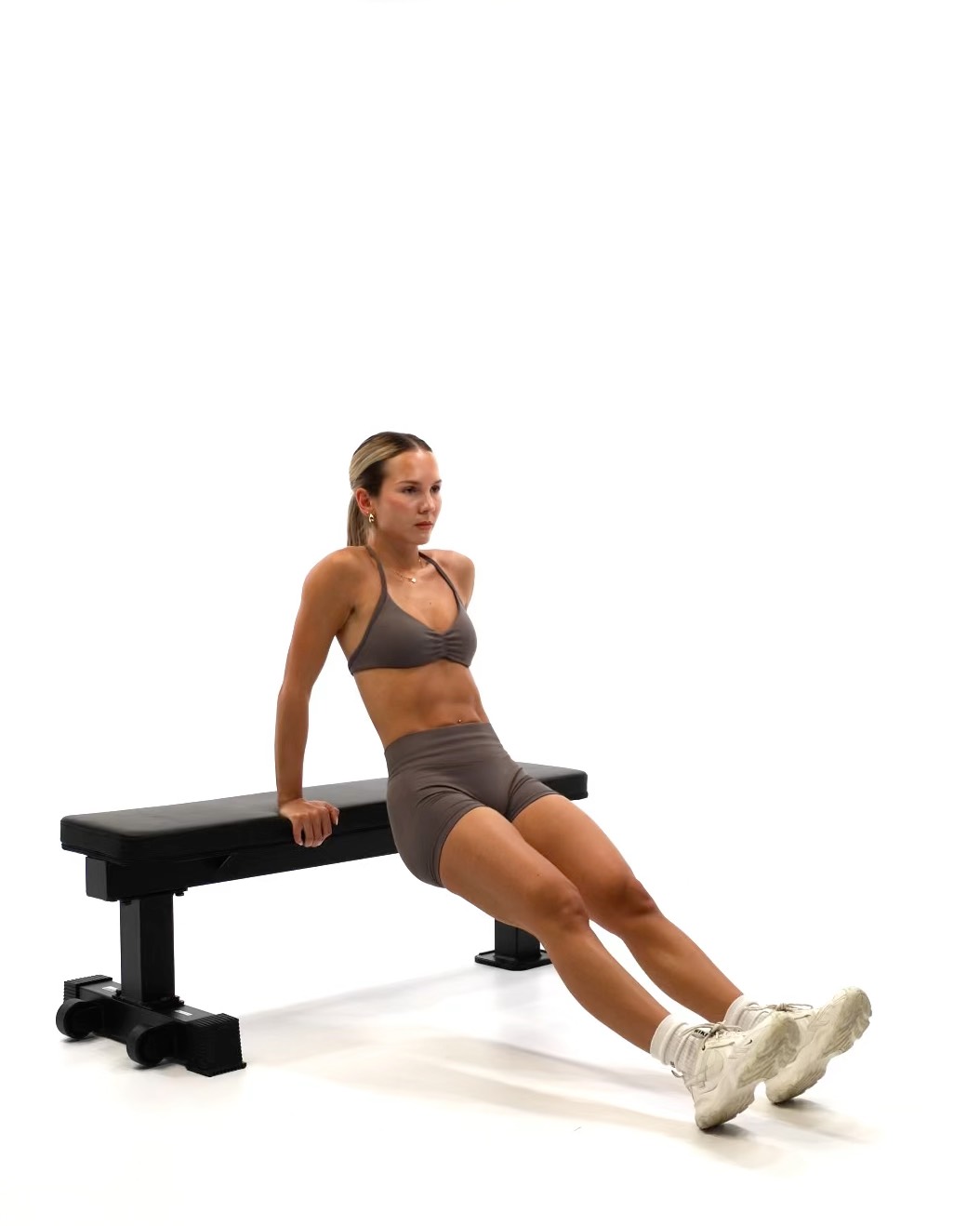 Setup - Sit on the edge of a bench with your hands placed next to your hips, fingers facing forward gripping the edge of the bench - Extend your legs out in front of you with your heels on the floor Movement - Begin by slowly bending your elbows to lower your body to the floor. Keep your elbows pointed backwards as you descend - You should feel the stretch in your triceps and shoulders at the bottom. Keep your elbows at about a 45 degree angle to your torso - After reaching the bottom of the dip, push through your palms to straighten your elbows to lift your body back up to the starting position