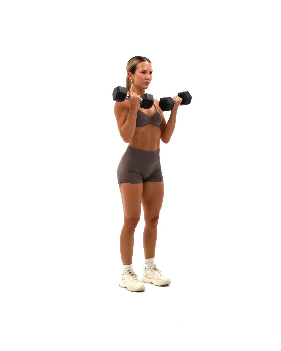 Setup - Stand with your feet shoulder width apart, and hold a dumbbell in each hand with your arms extended by your sides keeping a slight bend in your elbows - Your palms should be facing forward Movement - Curl the dumbbells towards your shoulders. Focusing on keeping your upper arms stationary towards the movement - only your forearms should be moving - Squeeze at the top and slowly lower the dumbbells back to the starting position