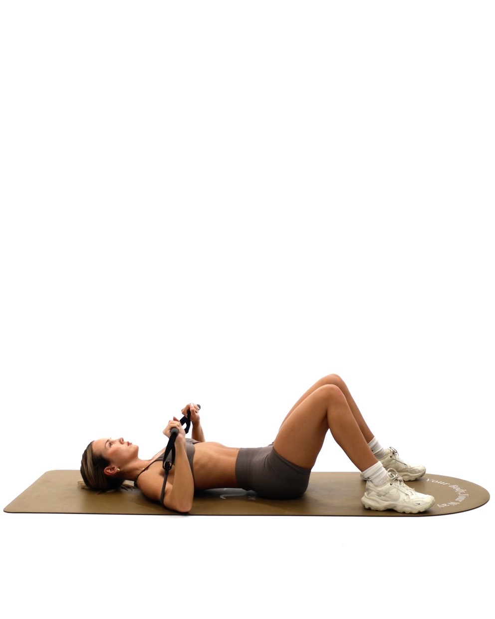 Setup - Lie flat on your back, knees bent, feet on the ground. - Loop the band around your upper back (just under your shoulder blades) - Hold the ends of the band in each hand at chest level, elbows bent about 90° Movement - Push the band straight upward until your arms are fully extended above your chest - Keep wrists stacked over your elbows, palms facing forward Squeeze your chest hard at the top - Slowly bring your hands back down until your triceps lightly touch the floor. Keep tension in the band