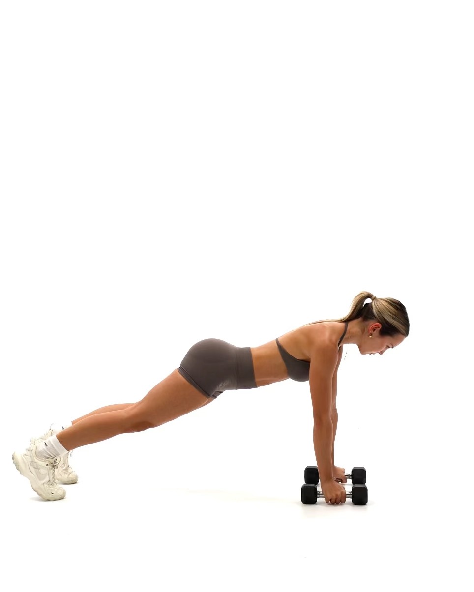 Setup -Start in a high plank position with a dumbbell in each hand, palms facing each other -Position your hands directly under your shoulders and your feet slightly wider than hip-width for balance -Keep your body in a straight line from head to heels -Engage your core and glutes to maintain stability throughout the movement Movement -Begin by performing a controlled push up, lowering your chest towards the ground -Keep your elbows close to your body and your core tight -Push back up to the starting plank position -Once at the top, row the right dumbbell toward your ribcage by driving your elbow up and keeping your body as still as possible -Lower the dumbbell back to the ground with control -Repeat the row on the left side -Continue alternating rows after each push up for the desired number of reps