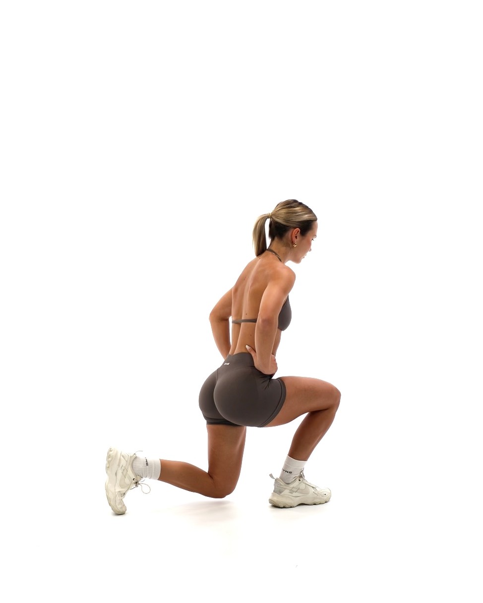 Setup - Stand upright with your feet hip width apart and your hands on your hips - Engage your core and keep your chest tall, maintaining good posture throughout the movement Movement - Take a step backward with your right leg, keeping your hips square and your torso upright - As you take a step back, lower your body by bending both knees. Your front knee should be directly above your ankle and bent at about a 90 degree angle, while your back knee should lower towards the floor - Your back knee should come close to your ground, but not touch it - Push through the heel of your front foot to return to the starting position, standing up and bringing your back foot back to the original standing position