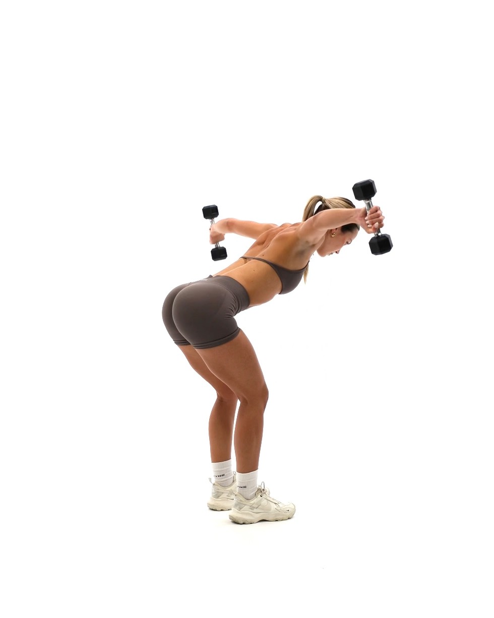 Setup - Hold a dumbbell in each hand with palms facing each other - Stand with feet hip-width apart and slightly bend your knees - Hinge forward at the hips so your torso is almost parallel to the floor. Keep your back straight and core engaged Movement - With a slight bend in your elbows, raise the dumbbells out to the sides until they reach shoulder height - Pause briefly at the top, squeezing your shoulder blades together - Slowly lower the dumbbells back to the starting position under control