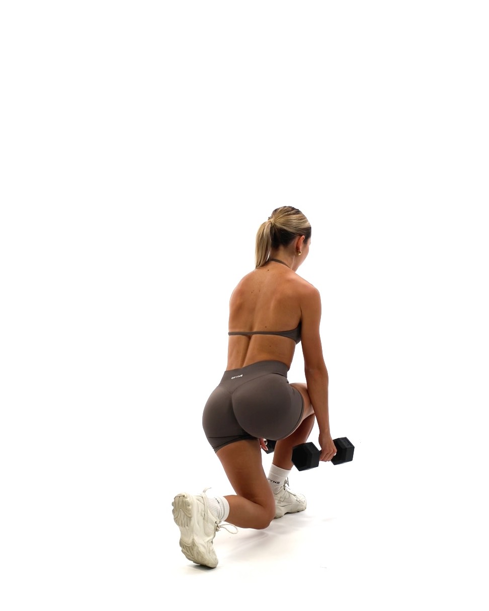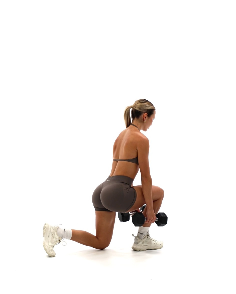 Setup - Stand with your feet hip width apart - Hold a dumbbell in each hand, letting them hang by your sides with your palms facing inwards Movement - Take a controlled step backward with one leg, lowering your body into a lunge position - Your front thigh should be parallel to the floor, with your knee directly above your ankle. Your back knee should lower towards the ground but don't let it touch the floor - Once at the bottom position of the lunge push through your front heel to return to the starting position, stepping forward with your back leg