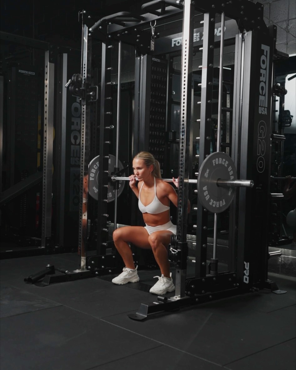 Setup - Position the barbell at shoulder height or just under - Stand under the bar and place it across your upper traps - Position your feet slightly wider than shoulder width apart Movement - Lower your body by bending your knees and hips, keeping your chest upright and core engaged - Descend until your thighs are parallel to the ground or deeper - Push through your heels to return to starting position