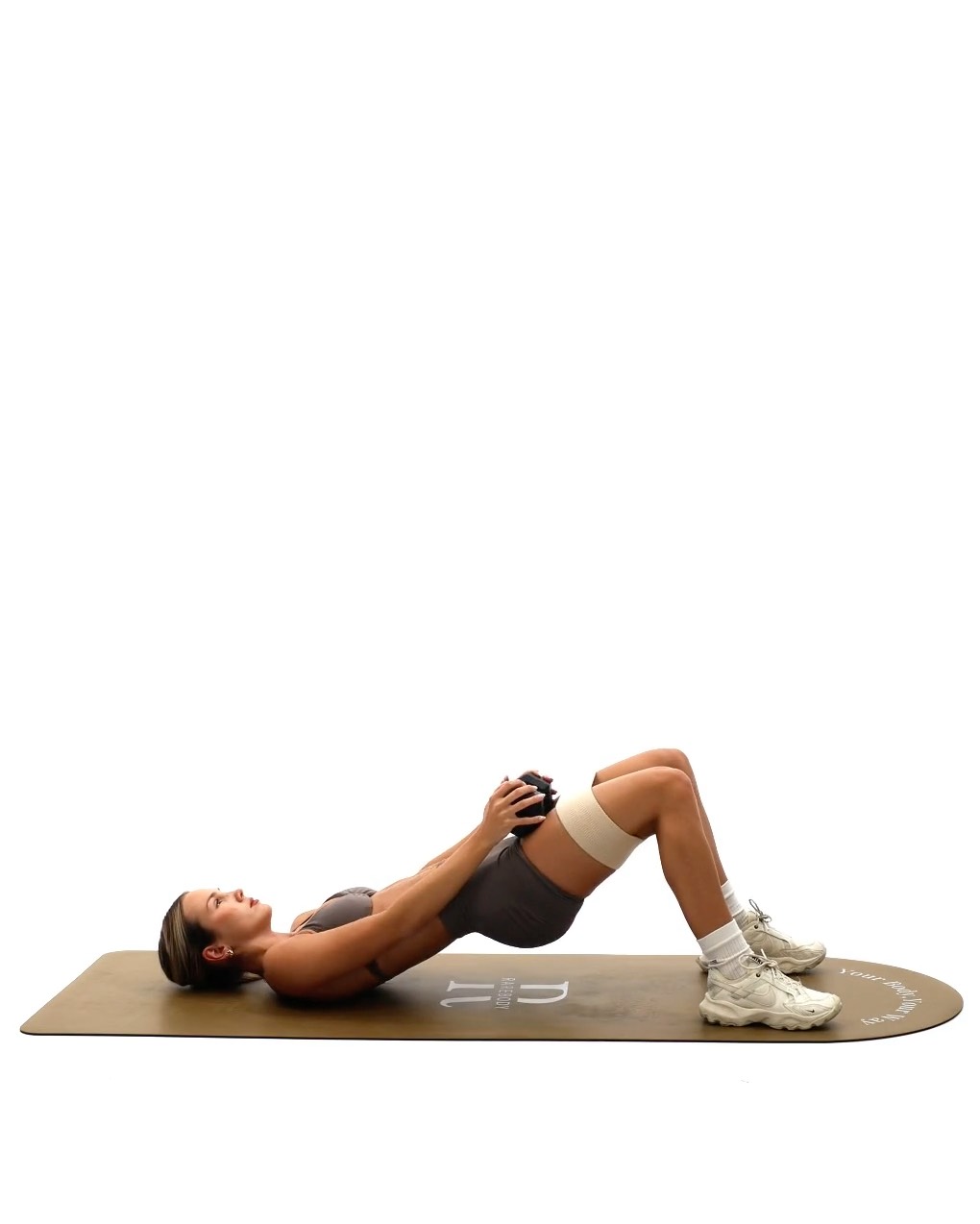 Setup - Take a loop resistance band and place it around your thighs, just above your knees - Grab a dumbbell and place it across your hips, holding it with both hands to keep it stable. The dumbbell will add extra resistance to the movement - Lie flat on your back with your knees bent, feet flat on the ground, about hip width apart - Push your knees outward into the resistance band to activate your glutes and hip abductors before you begin the thrusting motion Movement - Press through your heels and squeeze your glutes to lift your hips off the floor - As your hips rise, the resistance band will create more tension as your knees are pushed outward, engaging the gluteus medius more - Keep your upper body and head resting on the floor. Your body should form a straight line from your shoulders to your knees at the top of the movement - Slowly lower your hips back down to the floor, resisting the pull of the band as much as possible