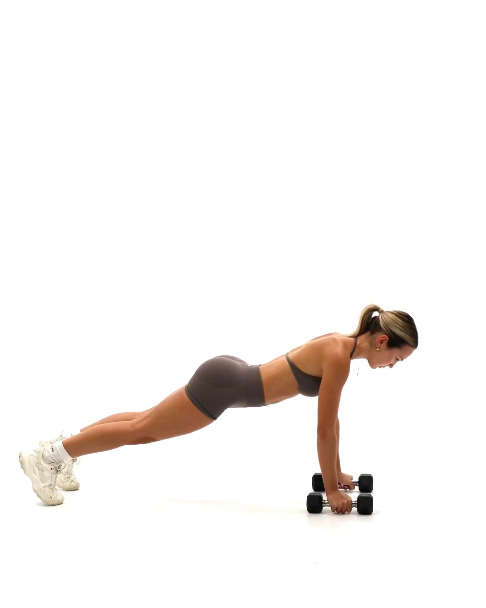 Setup -Start in a high plank position with a dumbbell in each hand, palms facing each other -Place the dumbbells directly under your shoulders and keep your arms straight -Set your feet slightly wider than hip-width to create a stable base -Keep your body in a straight line from head to heels, and engage your core to resist rotation Movement -Begin by rowing the right dumbbell toward your ribcage, keeping your elbow close to your body -Keep your hips square to the ground and avoid twisting through your torso -Lower the dumbbell back to the ground with control -Repeat the row on the left side -Continue alternating rows for the desired number of reps, maintaining plank position throughout