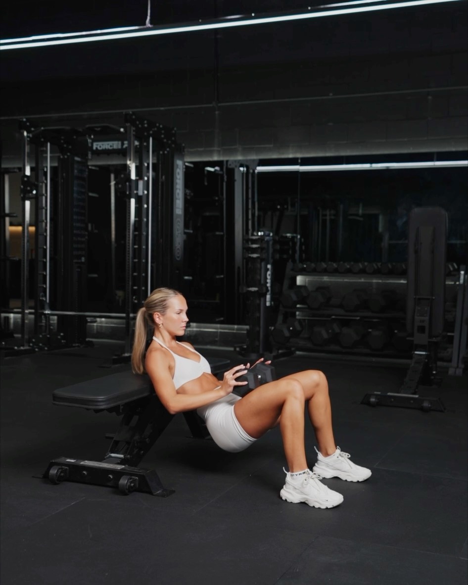 Setup - Sit on the ground with upper back rested against a bench or a box. Place your shoulder blades on the edge of the bench - Place dumbbell across your hips. Hold dumbbell in place by cupping your hands around it - Position your feet flat on the floor, slightly pointed outwards at shoulder width apart Movement - Push through your heels and drive your hips upward, focussing on contracting your glutes and hamstrings. As you lift your hips, ensure that your knees are slightly forward - At top of the movement, your body should form a straight line from your shoulders to your knees. Squeeze your glutes hard at the top - Slowly lower your hips half way down and repeat movement