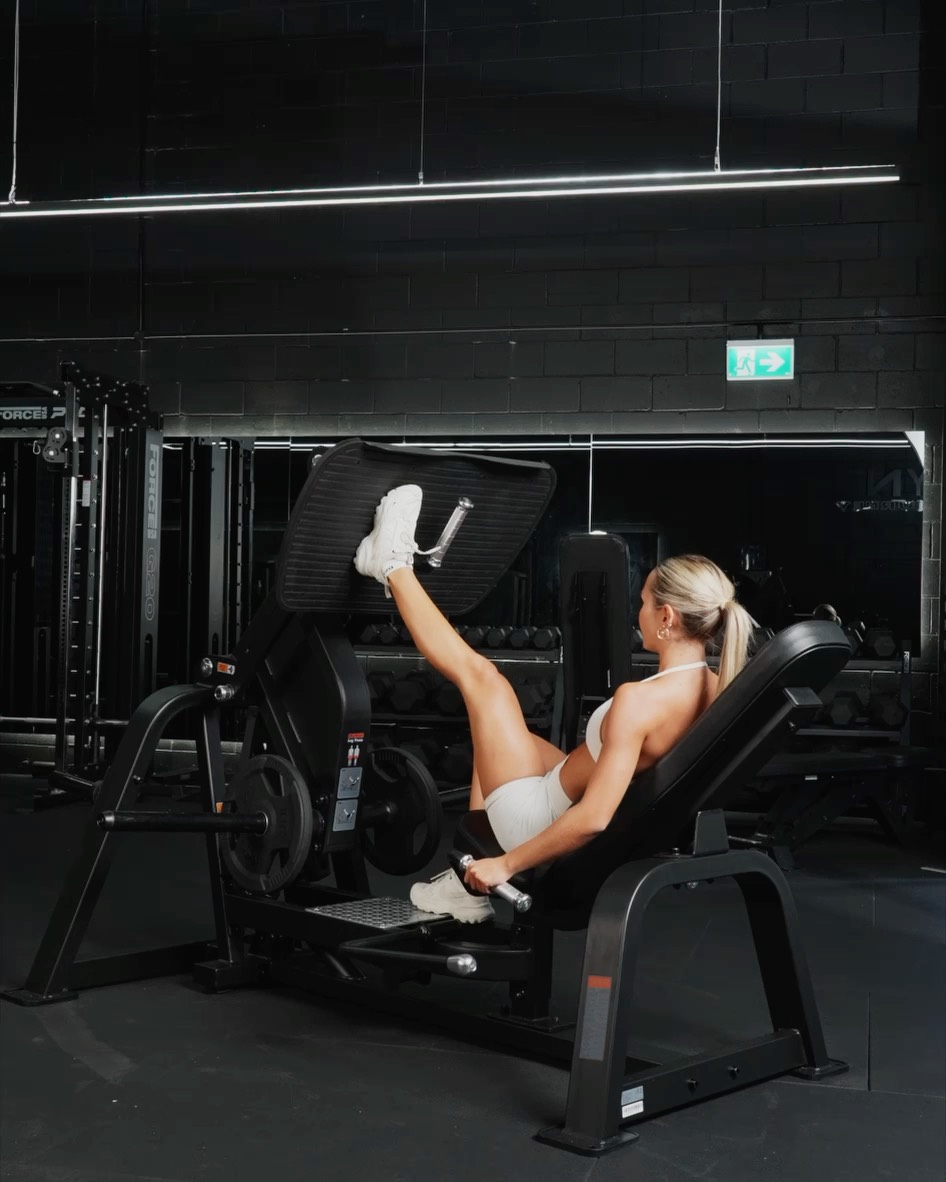 Setup - Sit on the leg press machine and position your back flat against the backrest - Place one foot in the middle of the foot platform while keeping the other foot off the platform or resting on the side Movement - Slowly bend your knee, lowering the platform until your thigh reaches about 90 degrees - Keep your foot flat on the platform and control the descent - Push through your heel and mid-foot, extending your knee until your leg is nearly straight